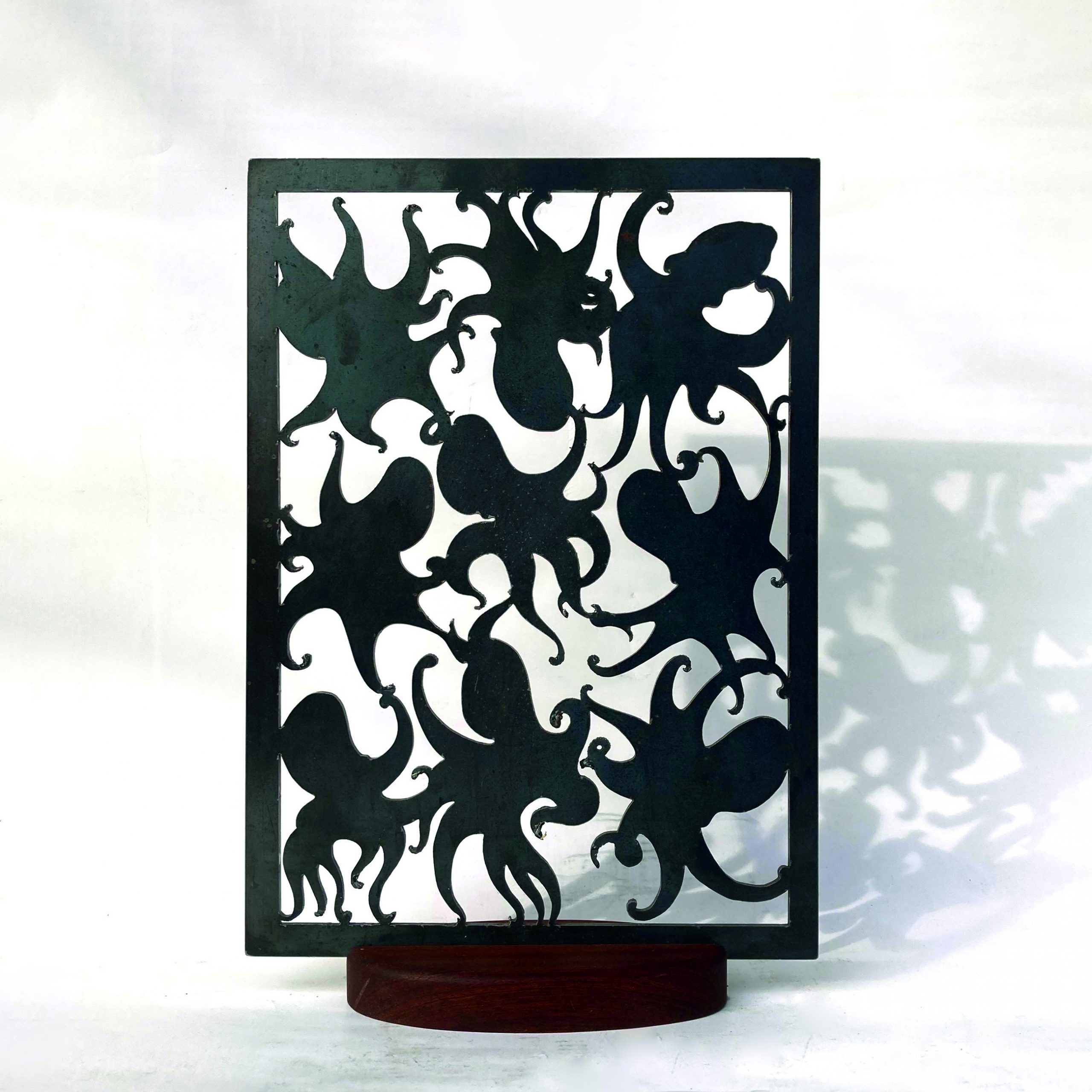 Das Kalenderblatt für Oktober ziert mein Krakenballett. Dabei handelt es sich um eine Stahlskulptur, die aus einer 3 mm starken Platte herausgearbeitet wurde und die von einem rechteckigen Rahmen umgeben ist. Innerhalb des Rahmens befinden sich neun Kraken, die mit ihren vielen Tentakeln, die einander suchen oder sich berühren, den Eindruck eines Tanzes oder Balletts erzeugen. Das Wechselspiel von Form und Umraum, das sich aus den Negativformen ergibt, erzeugt ein rhythmisches Spiel, das die Lebendigkeit unterstreicht.